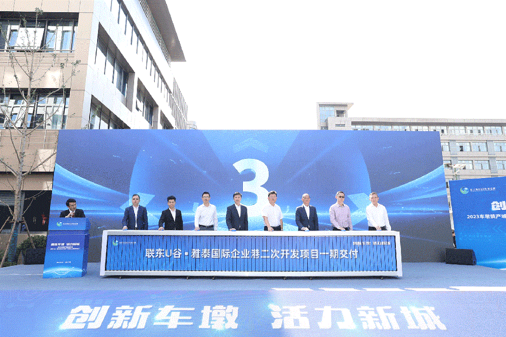 儀式最后,在熱烈的掌聲中,車墩鎮(zhèn)黨委書記高國相及區(qū)鎮(zhèn)相關(guān)領(lǐng)導(dǎo)與雅泰集團陳康富董事長、聯(lián)東U谷副總裁段朝暉一起,為車墩鎮(zhèn)產(chǎn)城融合項目聯(lián)東U谷·雅泰國際企業(yè)港二期工程合力按下了莊重的啟動鍵。